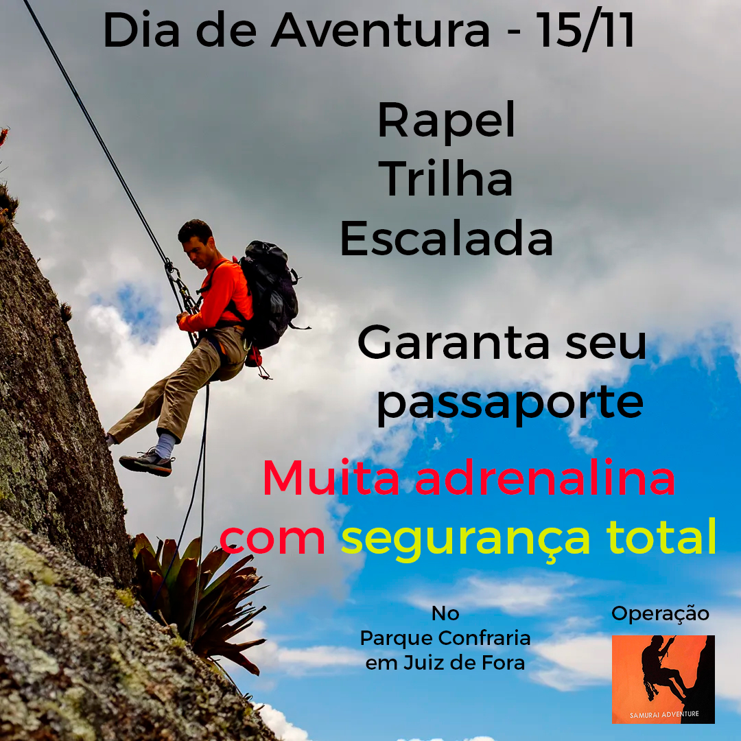 Olá! O Parque Confraria, em Juiz de Fora, está se preparando para um dia de aventura emocionante! Venha experimentar a adrenalina do Rapel, Escalada e Trilhas em meio à natureza exuberante. E o melhor de tudo, você pode contar com a segurança total promovida pelos instrutores da Samurai Adventure JF.